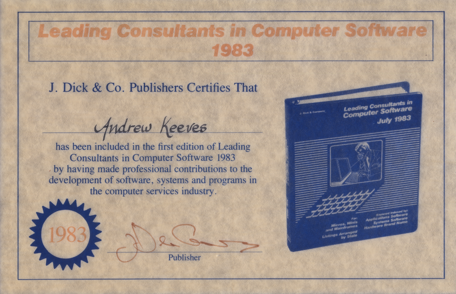 Inclusion of Andrew Keeves in the first edition published by J. Dick & Co., recognizing early professional contributions to software systems and computer services.