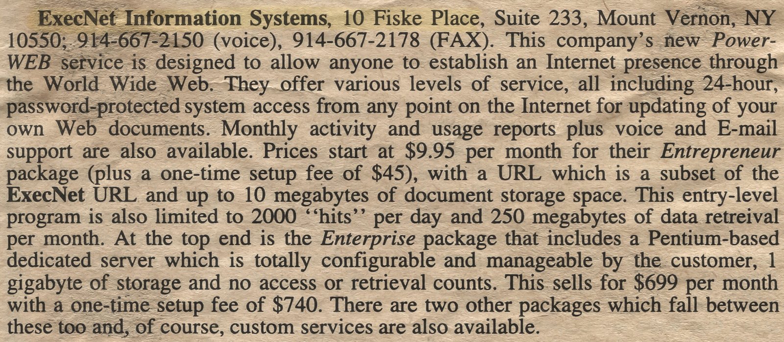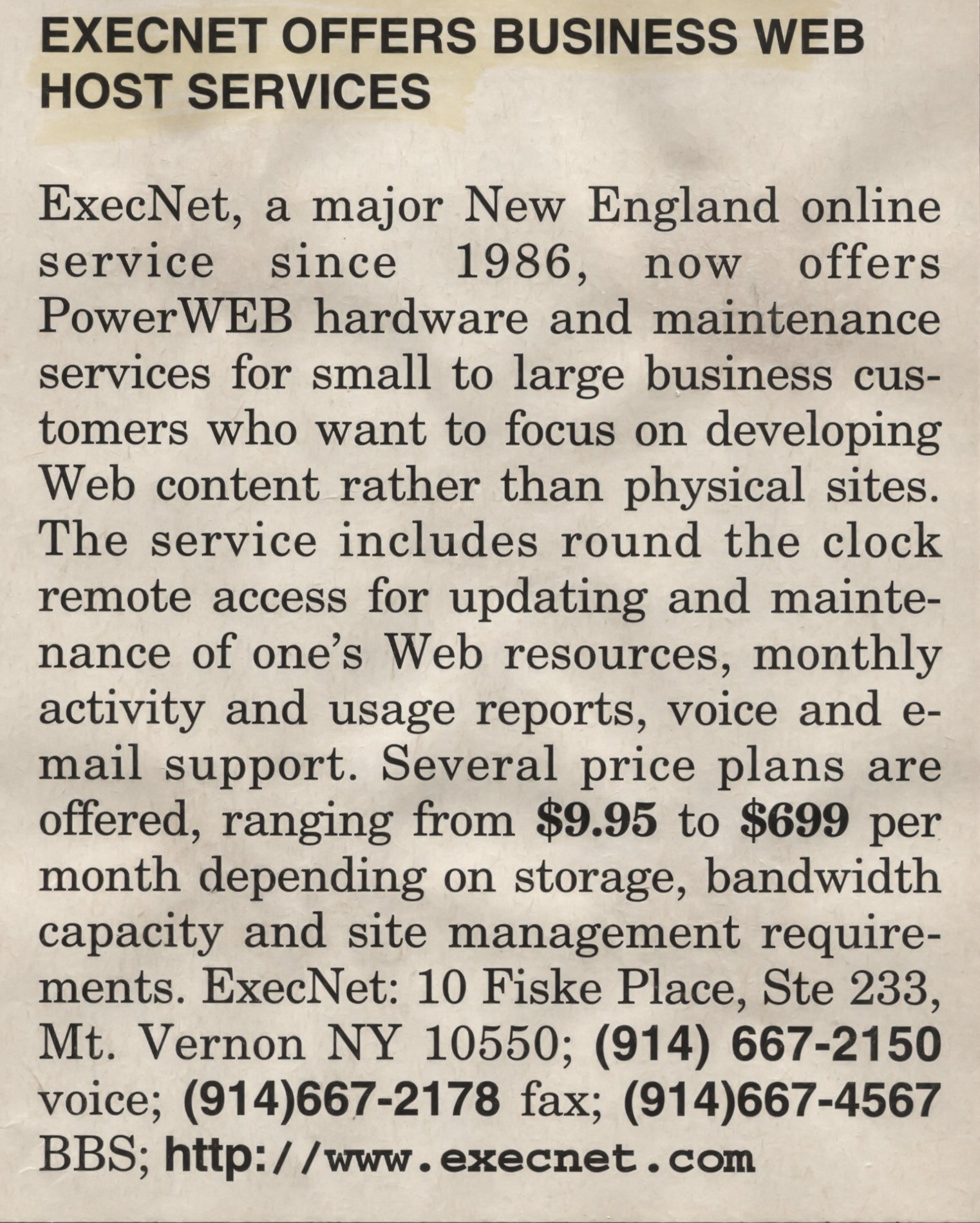 ExecNet announced its PowerWEB hardware and maintenance services, offering businesses hosted web
